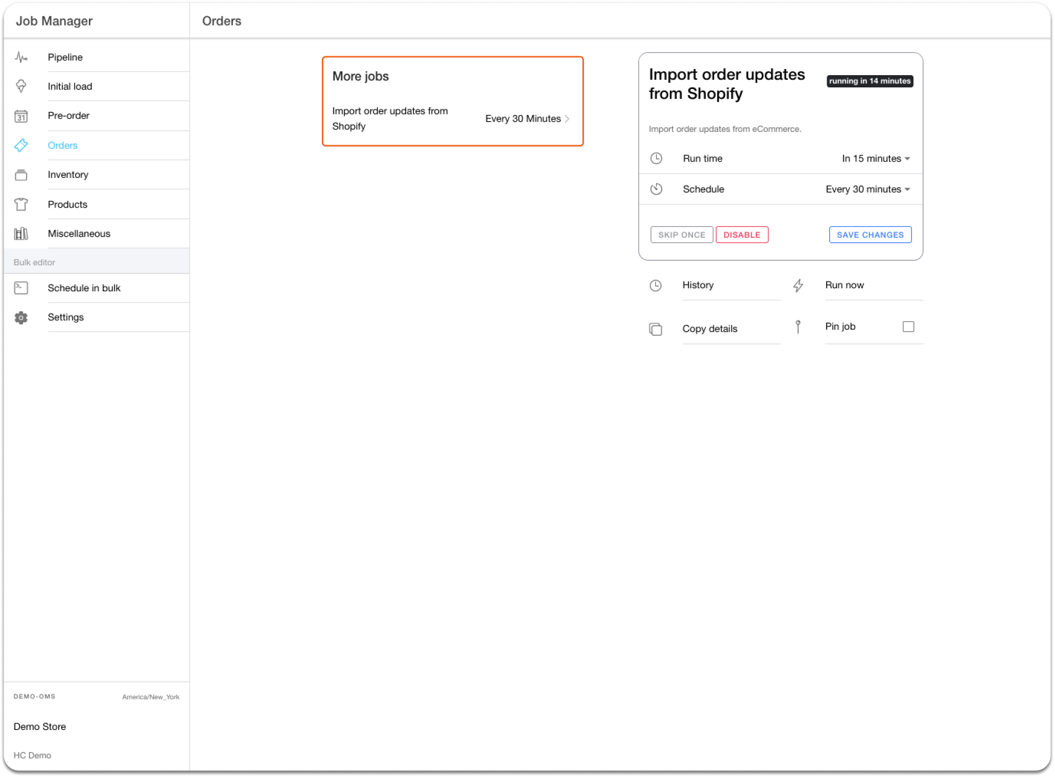 To ensure all order modifications are synced accurately, HotWax Commerce has an 'Import order updates from Shopify' job. This job checks the 'updated\_at' field of orders in Shopify and compares it to the last run time of the job. If the 'updated\_at' time is after the last run time, the job downloads all order details from Shopify, compares it to HotWax Commerce data, and updates any changed fields. The default frequency for the job is every hour, but merchants can change it through the Job Manager App to meet their requirements.