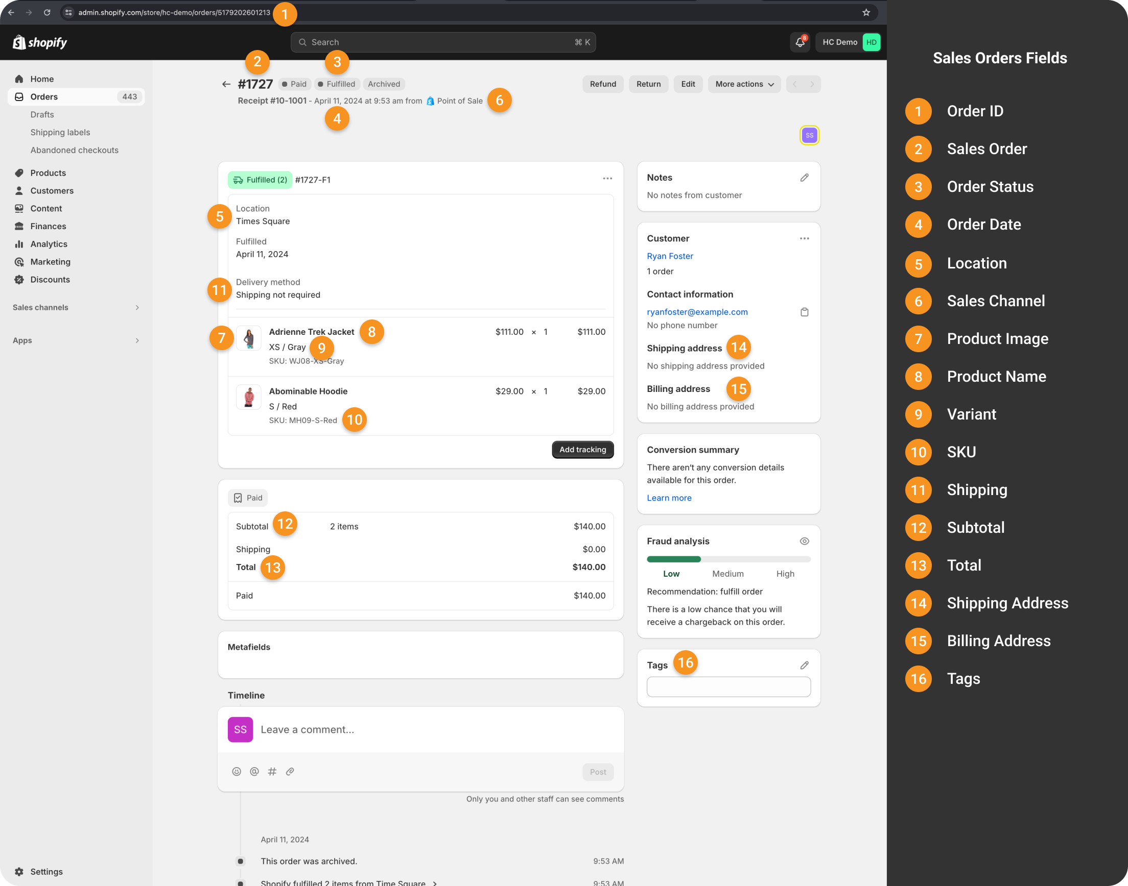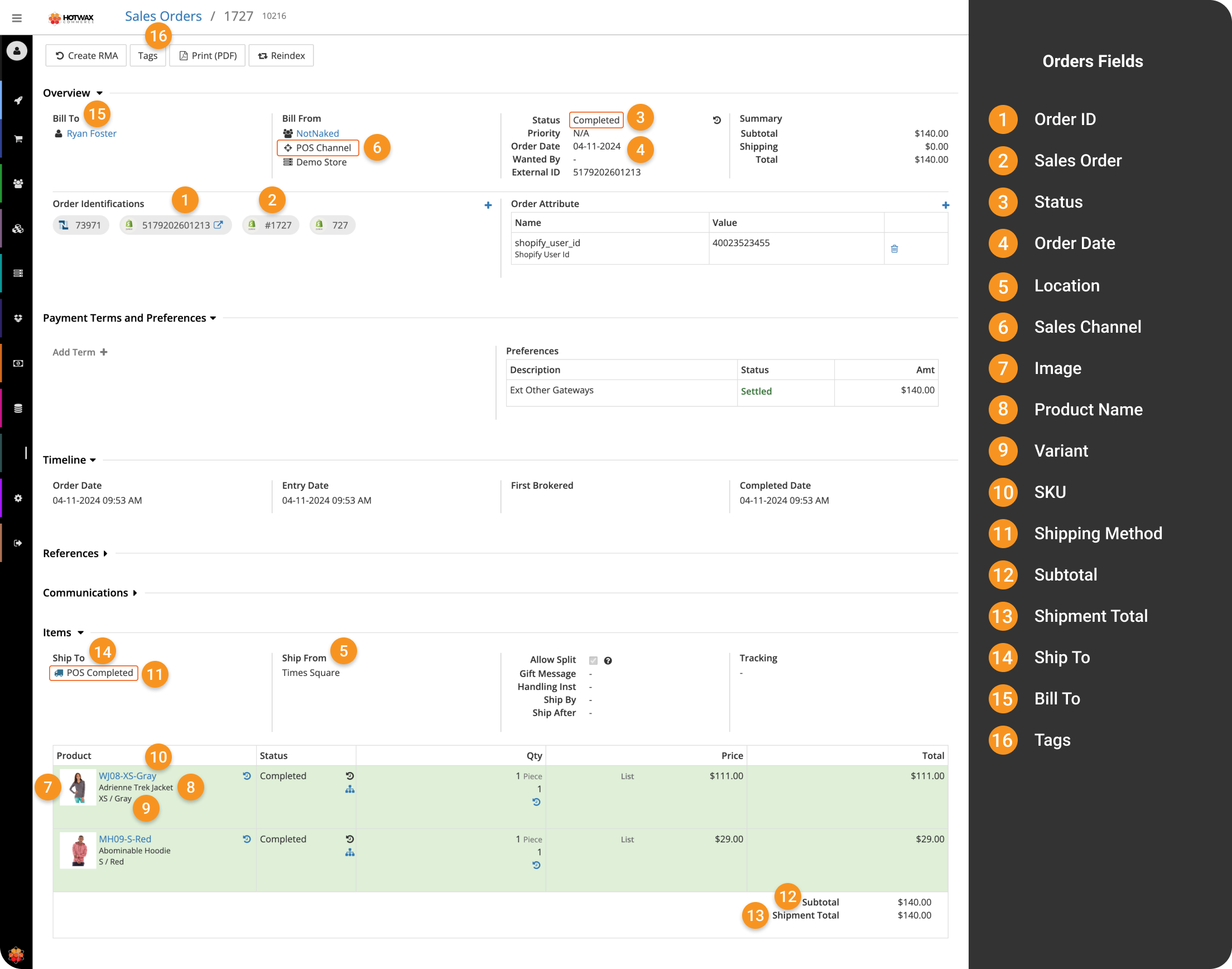POS sale fields in Shopify are mapped in HotWax Commerce just like any regular order. Certain fields such as Sales Channel, Status, and Shipping Method have different values for POS sales, reflecting how POS sales differ from regular orders.